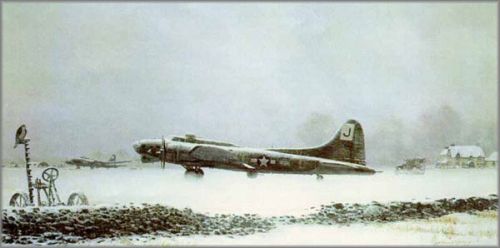 A B-17G of the 390th Bomb Group 569th Bomb Squadron sits peacefully under a blanket of snow at its home base in Framlingham, England.