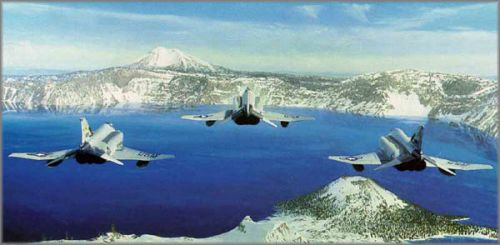 Three F-4 Phantoms, tucked in tight, howl over wintry Wizard Island OR. Since this is a national park, this unit of the Air National Guard needed official permission for a low flight.
