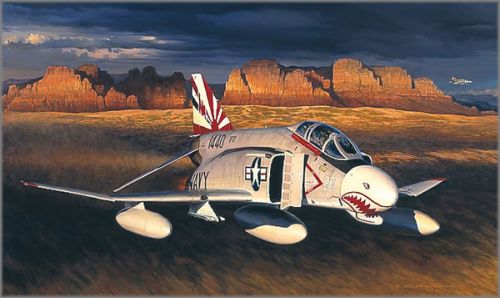 An F-4N of Navy squadron VF-111 moves down close and fast across the northeastern Arizona desert, mirrored by another in the distance. When VF-111 was established during the Second World War, it adopted the emblem of a setting sun, and during the late 1960s and throughout the 70s, the squadron had some of the most colorfully painted aircraft in the Navy inventory. William Phillips shows an F-4N as it looked in 1976, sporting red, white and blue tailmarkings to celebrate the Bicentennial.