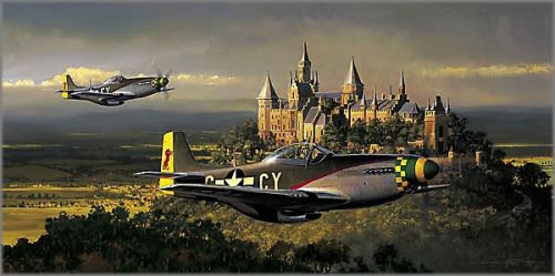 In 1944, after D-Day, the 343rd Fighter Squadron of the 55th Fighter Group transitioned from the P-38 Lightning to North American P-51 Mustangs. With its extended range, the Mustang afforded the 343rd the capability of escorting 8th Air Force bombers to the target and back. The squadron saw action against ground targets during the Battle of the Bulge in the winter of 1944-45. Two of the fighters are shown in loose trail formation streaking past a hilltop castle fortress that that, as a symbol of Teutonic might, dominated the German countryside. Now, softened in the glow of low-cast sunlight and guarding peaceful sunlit fields, the castle symbolizes home for a better future. - WP
