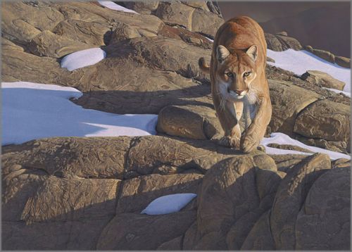 Mountain lions epitomize stealth and grace. They maintain fluidity of movement over unseen rock surfaces with amazing agility. They can leap up to twenty feet and subsequently are formidable predators. This great cat’s eye contact with its quarry creates a strong focal point and leaves no doubt that this feline is Fully Engaged. - DS