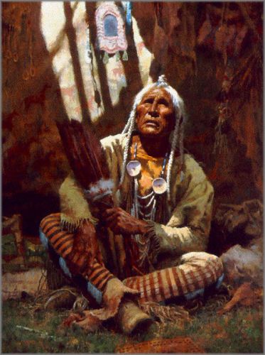 A once valiant, now aging, warrior with silver hair and weathered brow sits in prayer or private ceremony. The ancient one looks aloft toward greater spirits or memories past. With gnarled hand, he holds aloft the dark feathers of an eagle and offers words of experience to the unseen. - HT