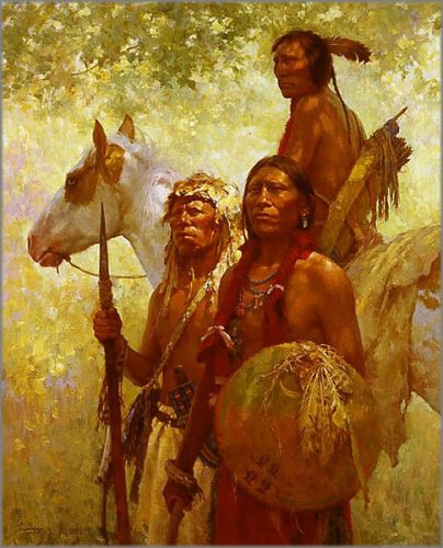 This image painting provided me with the opportunity to portray three strong and resolute Cheyenne warriors in a simple setting of tranquility which belied the very nature of their responsibilities as providers and protectors of their women, children and old people.