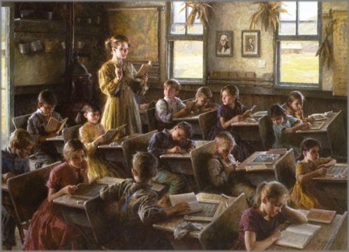 The one-room schoolhouse goes back to the founding of our great country. It evolved through the decades but the general idea remained the same. I painted the time period that I know and love best, the post Civil War era. I decided to place the teacher as the focal point, a tribute to all the dedicated teachers that help build this nation.