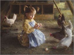 I never cease to be inspired by the wonder and curiosity of children. This little farm girl loves to spend time with her chickens and found her way into the coop one day. This serene moment I painted changed rapidly after she decided to stick her thumbs into the eggs to see what would happen. It got pretty messy. - MW