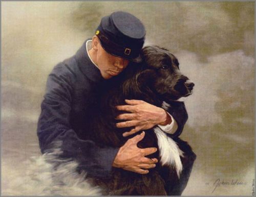 During the Civil War, dogs served as troop mascots, demonstrating bravery and loyalty in camp and on the battlefield. These mascots were an inspiration, bringing about unity while representing beloved pets at home. For soldiers, the act of nurturing offset boredom in camp, and the dogs would enjoy a charmed life lavished with affection. In this powerful image, this mascot provides much needed sanctuary to a young soldier who has undoubtedly witnessed the many horrors of war. - JW